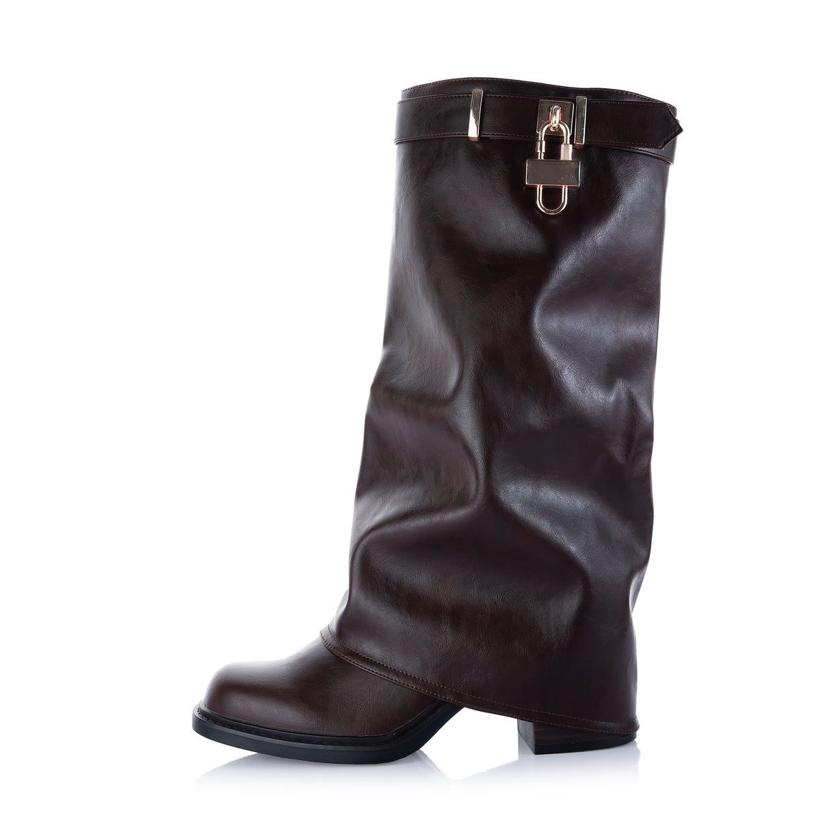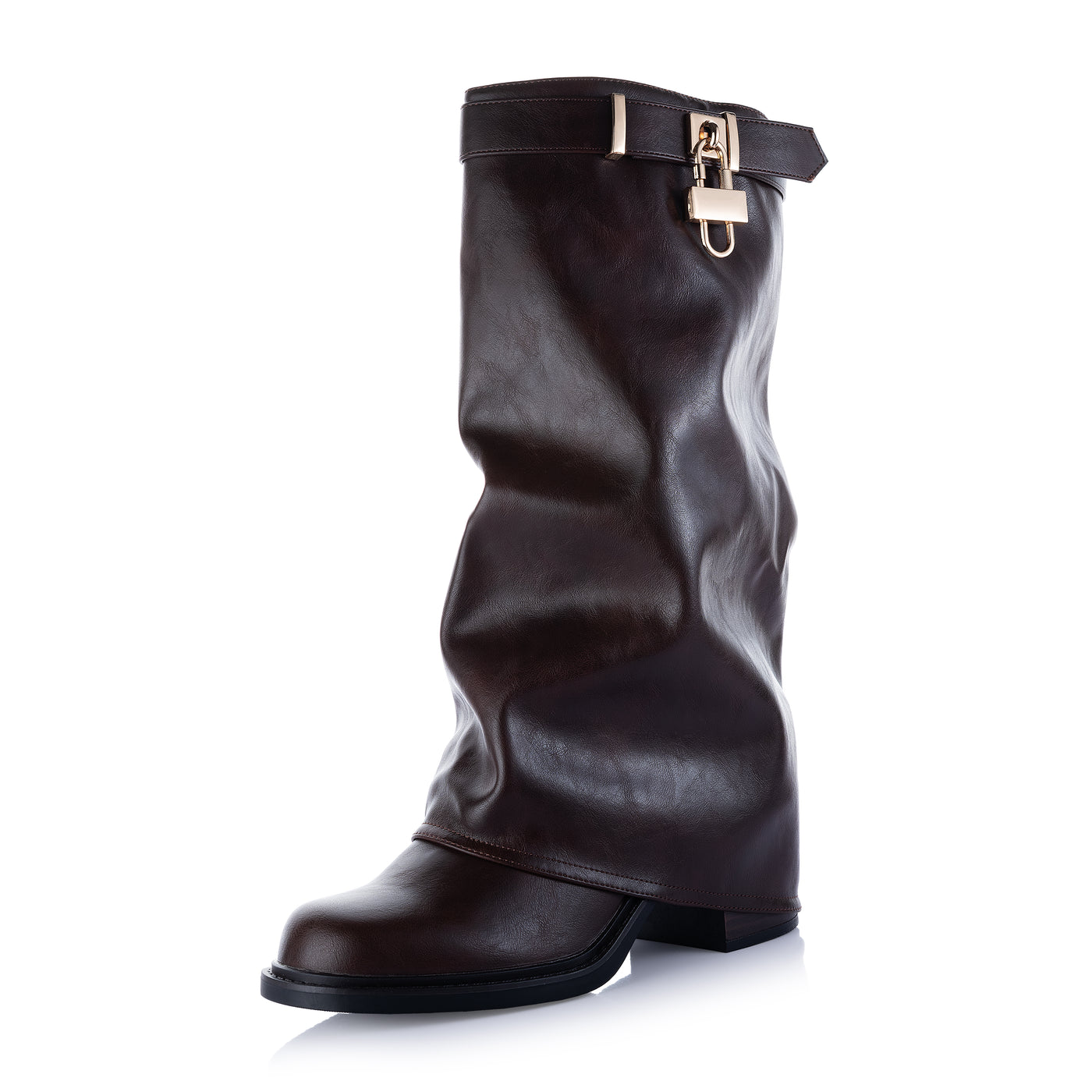 Step into standout style with these Chic Fold over Black faux Leather Shark Boots. Crafted from sleek, faux leather, these boots feature a bold, shaft design that drapes elegantly over the ankle, creating a contemporary silhouette. The chunky cleated sole adds durability and edge, while the inner side zipper ensures easy wear. Finished with a refined gold-tone buckle detail at the cuff, these statement boots are perfect for turning heads while staying effortlessly comfortable.